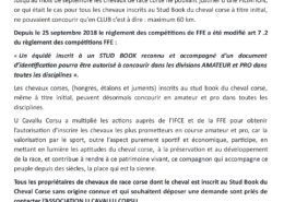 Depuis le 25 septembre 2018 le règlement des compétitions FFE a été modifié. Tous les chevaux peuvent concourir dans les divisions AMATEUR et PRO dans toutes les disciplines même s’il ne peuvent justifier de leur filiation. Ce qui est le cas pour nombre de chevaux corses inscrits à titre initial.