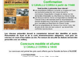 Une Commission d’approbation et un concours modèle et allure Cheval Corse primé était organisé le Samedi 28 juillet 2018 Fiera d’Auddè. L’Associu remercie le Comité de Foire d’Auddè qui a offert tous les prix distribués ainsi que Mr De Angeli pour son accueil et son implication, ainsi que tous les participants qui ont fait le déplacement avec leur chevaux.